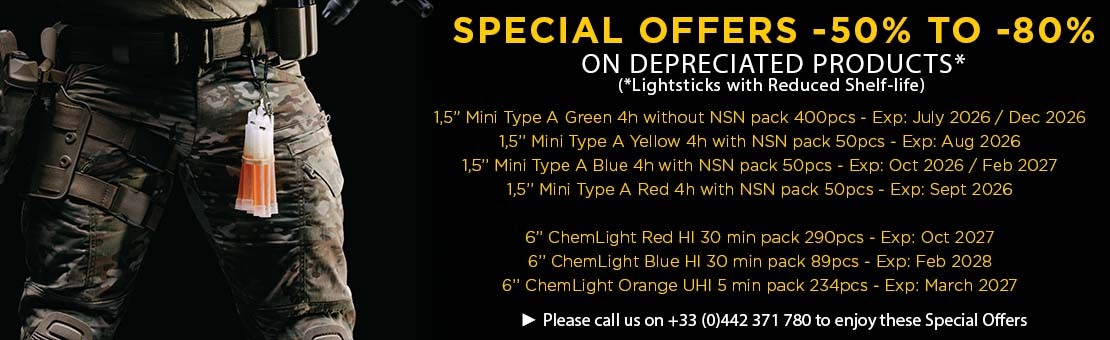 ChemLight is die Referenz der Leuchtstäbe, die von der Armee eingesetzt werden. Verfügbar in 6 Farben und in Infrarot.