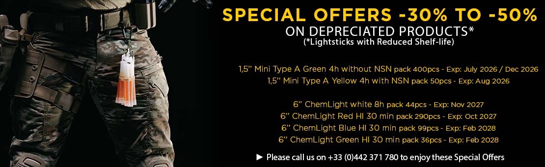 ChemLight es la referencia de las barras de luz utilizada por el ejército. Disponible en 6 colores e infrarrojo.